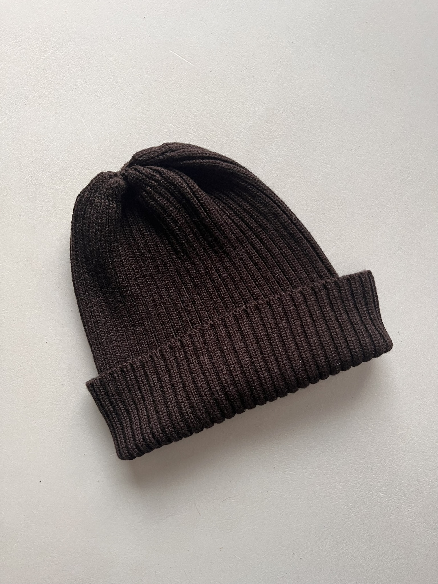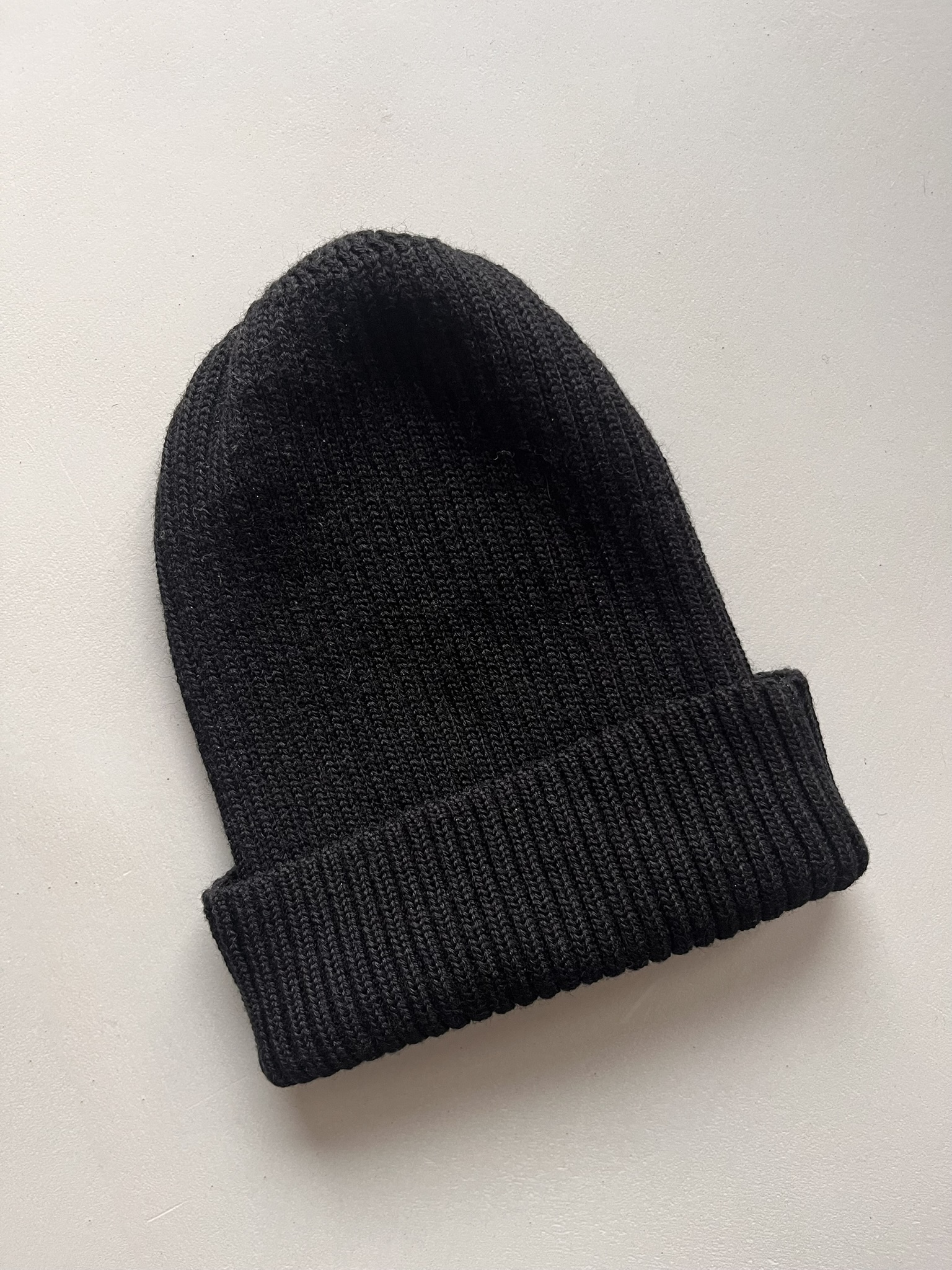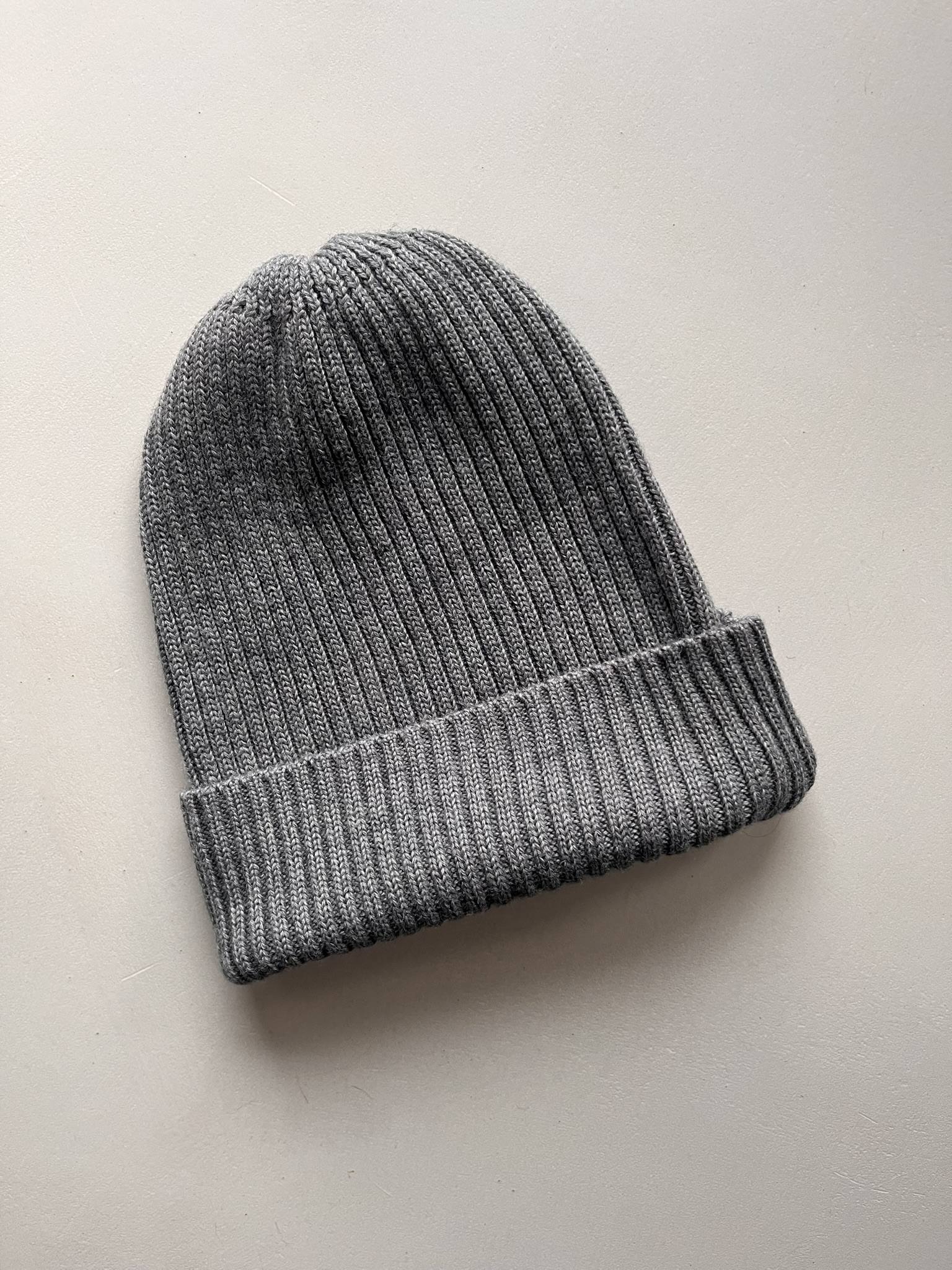 Minimalistinė „beanie“ stiliaus kepurė, megzta tampriu stulpelių raštu. Dėl elastingo mezgimo gražiai prisitaiko prie galvos formos, o atlenkiamą kraštą galima reguliuoti – nešioti aukščiau arba su platesniu atlenkimu.